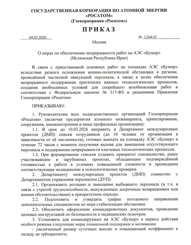 Корреспондент «Комсомольской правды» Анастасия Камская В распоряжении нашего издания оказался внутренний приказ Госкорпорации «Росатом». Документ предписывает срочную ротацию персонала на АЭС «Бушер» в Иране,…