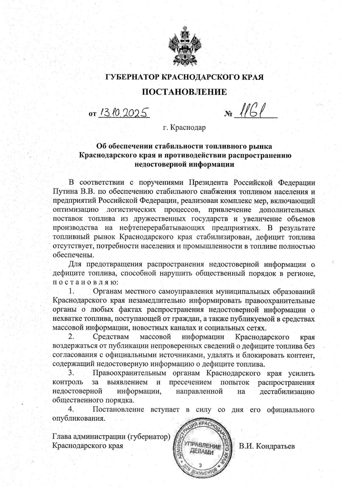 Возьмем свежий пример из Краснодарского края. Губернатор Вениамин Кондратьев издал постановление «Об обеспечении стабильности топливного рынка Краснодарского края и противодействии распространению недостоверной информации». В нем черным по белому написано: проблемы с топливом «полностью устранены», дефицита нет, рынок стабилизирован. А вся информация о нехватке — фейк, который якобы сеет панику. Что дальше? Органам местного самоуправления предписано стучать в правоохранительные органы на любого, кто посмеет упомянуть дефицит — будь то гражданин в соцсетях или журналист в СМИ. СМИ рекомендовано (читай: приказано) воздерживаться от публикаций без визы от властей, ссылаться только на официальные данные и немедленно удалять «недостоверный» контент. Правоохранителям — усиливать контроль за «пресечением попыток дестабилизации». Контроль за этим фарсом возложен на заместителя губернатора.