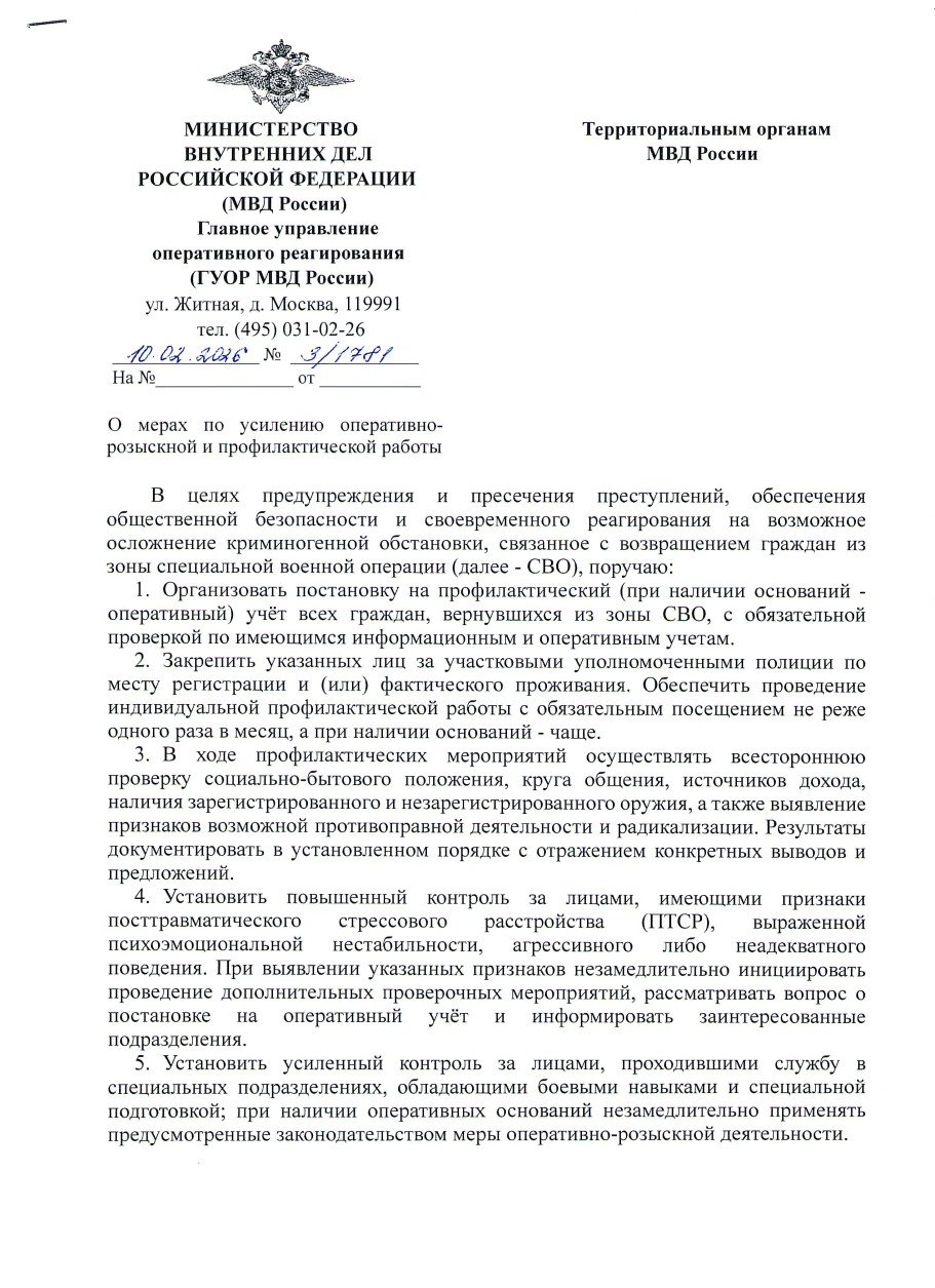 Суть документа сводится к усилению профилактического контроля: постановка на учёт, закрепление за участковыми, регулярные проверки, анализ круга общения, источников дохода, наличия оружия и возможных признаков радикализации. Отдельный акцент делается на тех, кто имеет боевой опыт в спецподразделениях, а также на людях с признаками посттравматического стрессового расстройства.