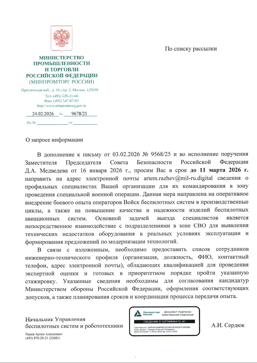 В конце февраля 2026 года оборонные предприятия, производящие беспилотники, получили письмо от Министерства промышленности и торговли Российской Федерации: до 11 марта предоставить списки инженеров для «стажировки» в зоне СВО. Цель объявлена благородной: внедрить боевой опыт операторов прямо в производство, выявить недостатки в реальных условиях и ускорить модернизацию.